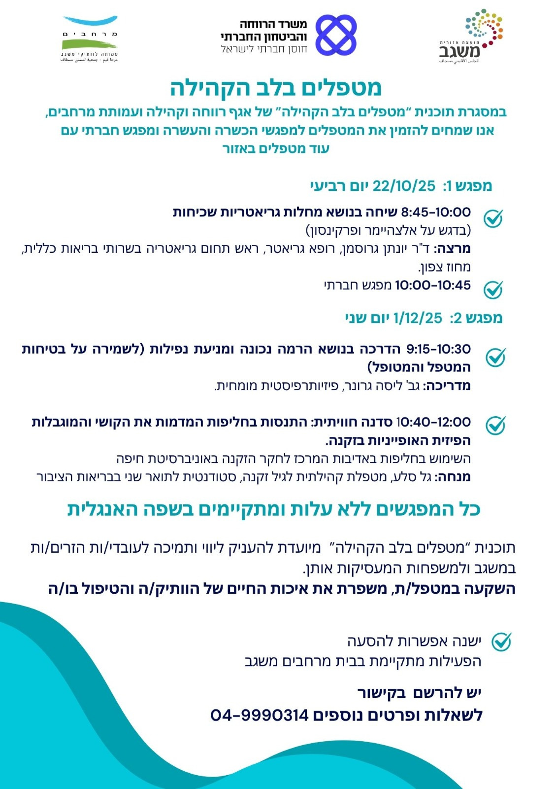 במסגרת התוכנית "מטפלים בלב הקהילה" יתקיים המפגש הראשון לשנה זו ביום רביעי הקרוב , 22/10. בשעה 08:45