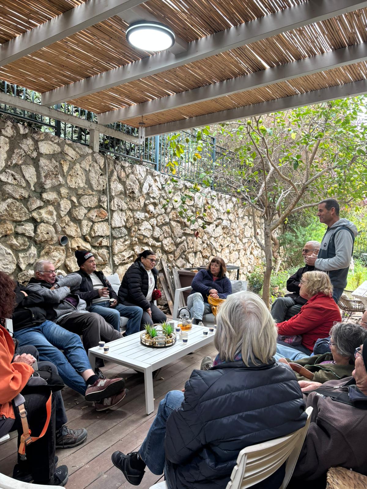 שי אירח אותנו בחצר ביתו וסיפר על היצירות, דרך העבודה שלו וההשראה ליצירה שלו.
