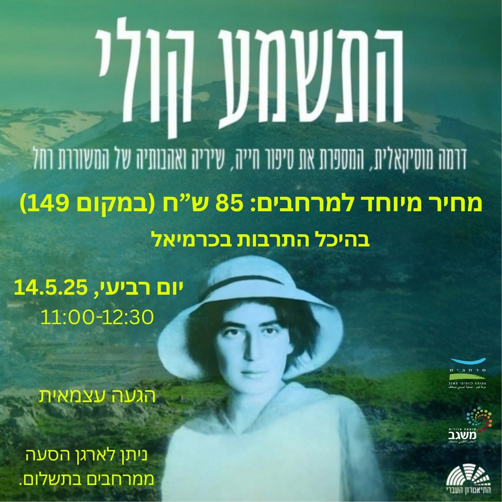 אנו שמחים להזמיננכם להצטרף להצגה "התשמע קולי" -דרמה מוזיקלית המספרת את סיפור חייה, שיריה ואהבותיה של רחל המשוררת.