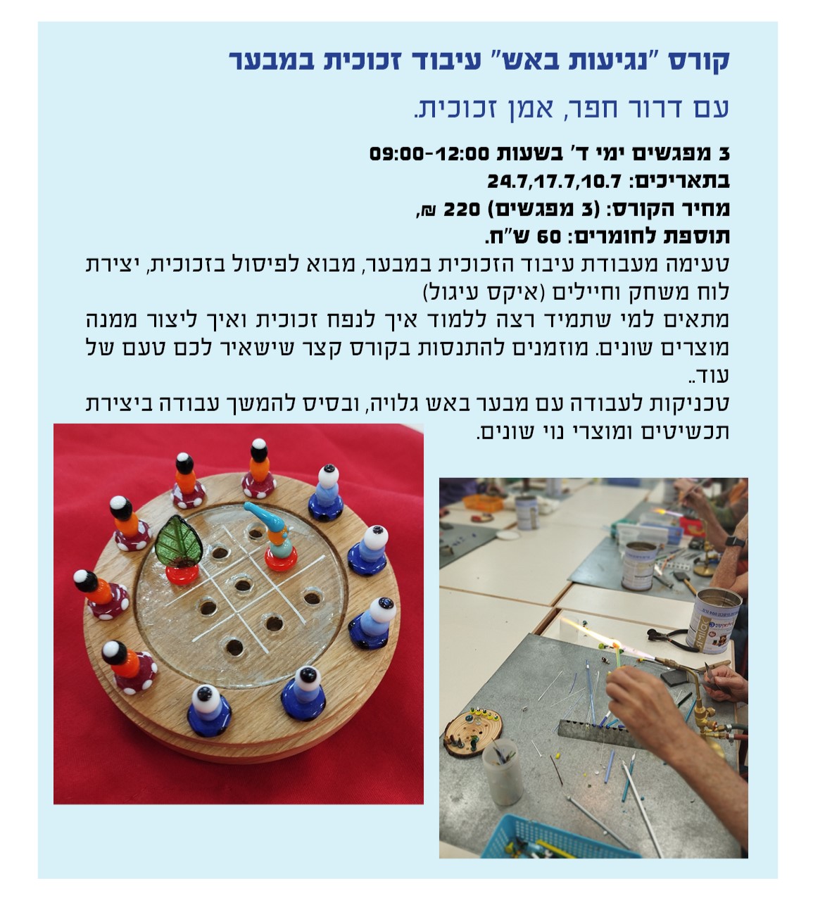 מוזמנים/ות להצטרף לקורס שיתן לכם/ן טעימה מעולם עיבוד הזכוכית במבער, מבוא לפיסול בזכוכית..תוך כדי יצירת לוח משחק איקס עיגול וחיילים.