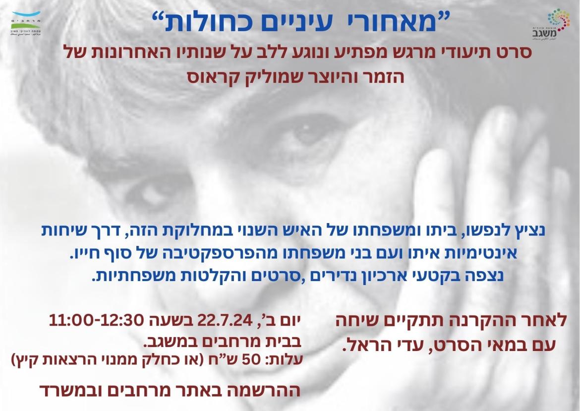 ביום שני הקרוב, 22.7.24 יוקרן במרחבים הסרט התיעודי המרגש "מאחורי עיניים כחולות" על שמוליק קראוס