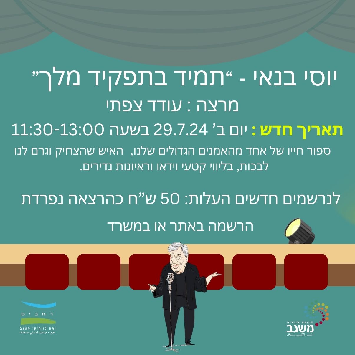 ביום שני 29.07.24 בשעה 11:30 תתקיים ההרצאה על יוסי בנאי " תמיד בתפקיד מלך"