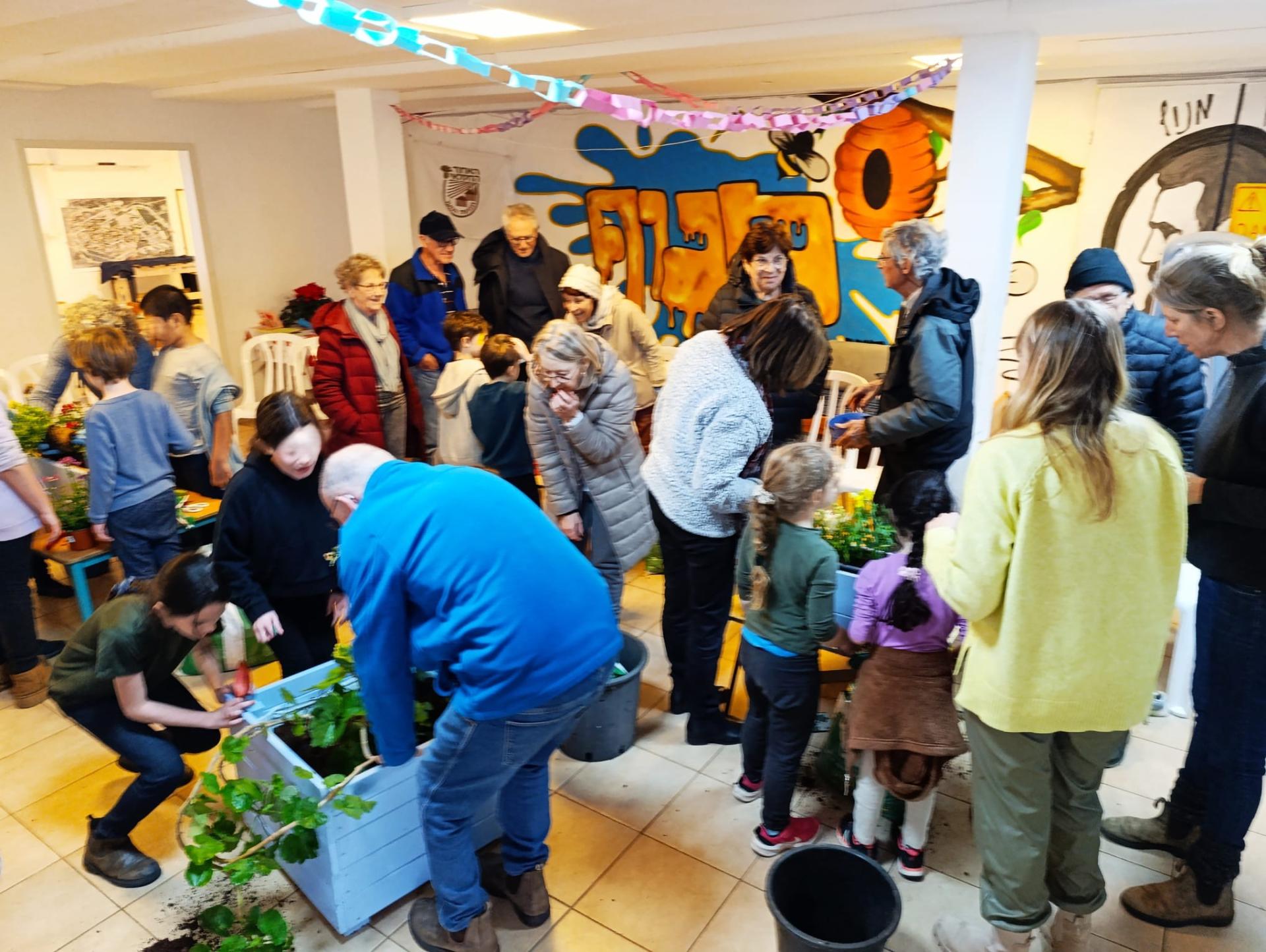 שתילת הצמחים באדניות והצבתם במיקום החדש שכל כך מוסיף יופי למועדון הוותיקים.